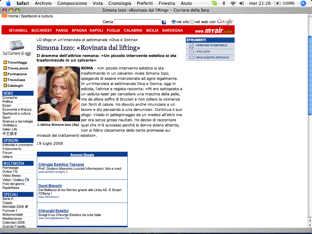 Corriere della Sera, 19 luglio 2006:Simona Izzo: «Rovinata dal lifting»